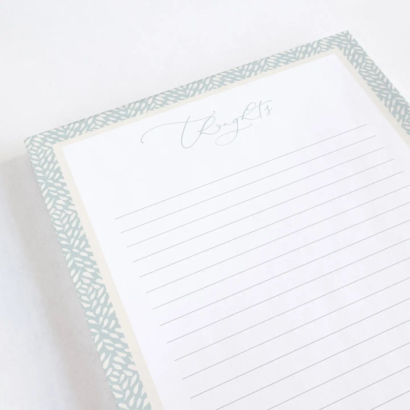 This medium notepad features a blue geometric pattern with the word "Thoughts" at the top, 52 lined sheets of high quality 100gsm acid free paper, a 500gsm greyboard backer with gold foil details.